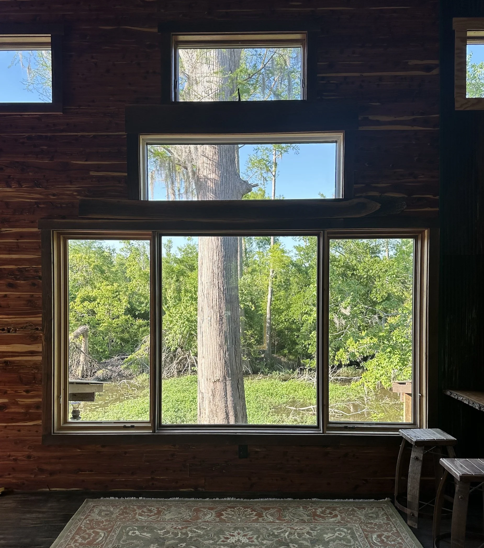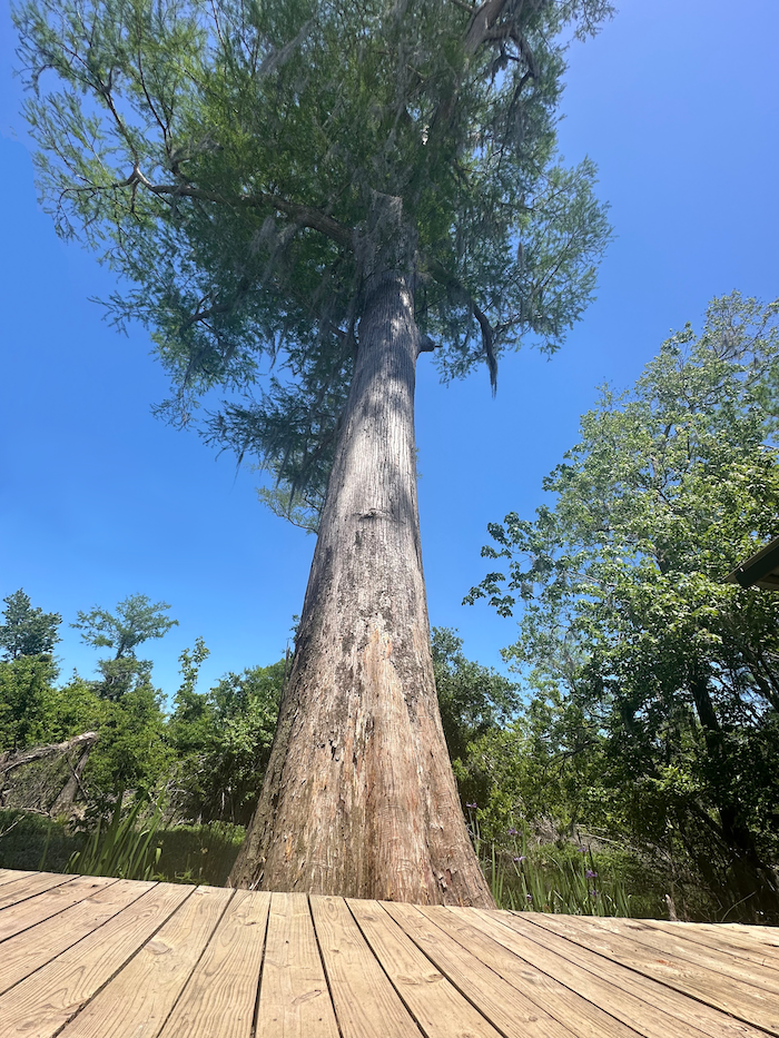 Swamp Camp offers a unique peaceful retreat to nature enthusiasts in the heart of Louisiana swamp country. We are at the dead end of quiet one mile road called “Happywoods.” Our camp, up on piers, is situated in the wetlands along the Tickfaw River and adjoining Tickfaw State Park. We look out onto a wilderness sanctuary with turtles, alligator, beaver and otter along with a variety of water birds among the characters. The camp is built centered on a 300 plus year old cypress tree.